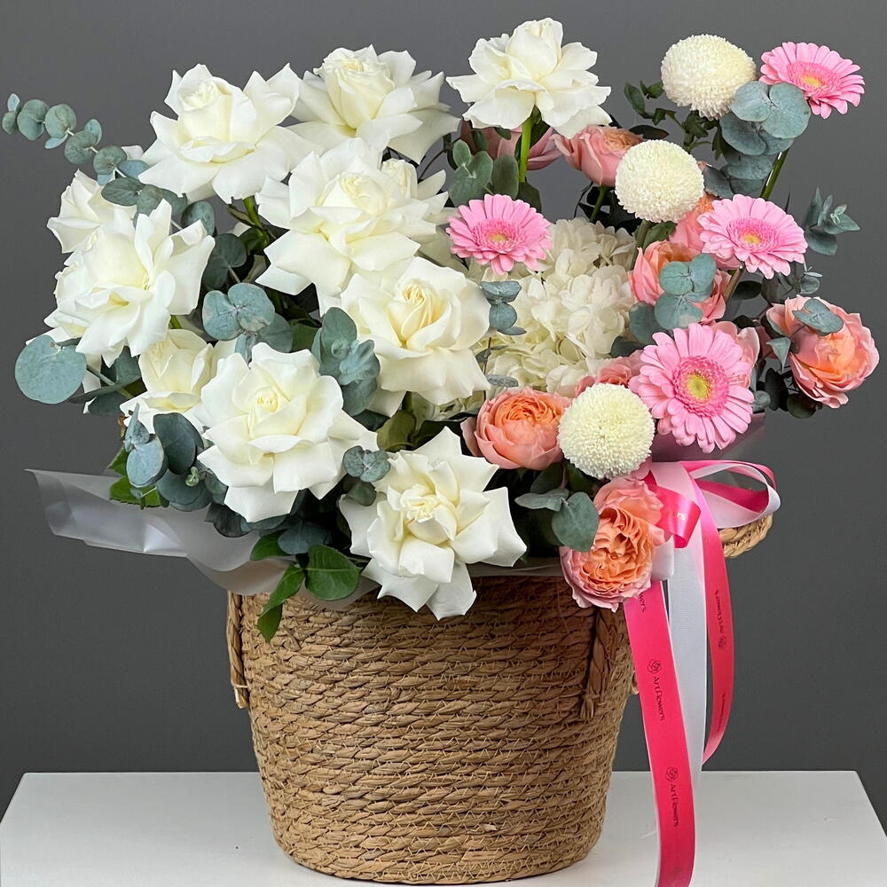 This bouquet is about purity of thought, inner peace and bright emotions. White flowers with delicate pink accents look fresh, elegant and very expensive.