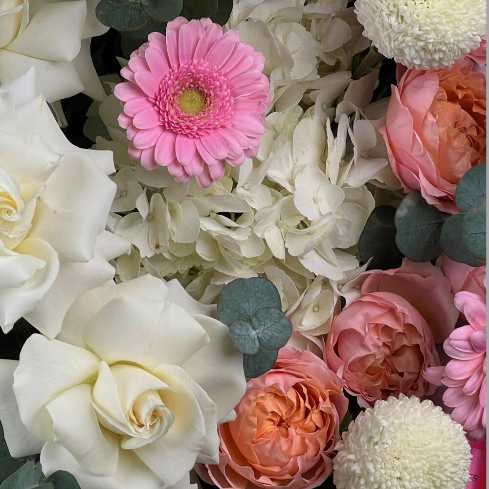 Hydrangea - 1 pcs Eucalyptus - 2 pcs Rose - 13 pcs Gerbera - 4 pcs chrysanthemums - 3 pcs rose spray - 2 pcs