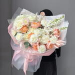Alstroemeria - 3 pcs Hydrangea - 3 pcs Tape - 1 pcs Matthiola - 3 pcs Eucalyptus - 1 pcs Rose - 5 pcs Carnation - 7 pcs Eustoma - 2 pcs Decoration - 1 pcs Lagurus - 15 pcs Spray rose - 4 pcs