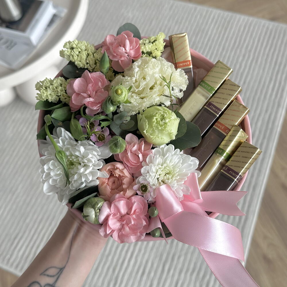Spray carnation - 1 pcs Box - 1 pcs Spray rose - 1 pcs Merci chocolate - 6 pcs chrysanthemums bush - 1 pcs