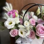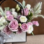Rose - 13 pcs Eustoma - 2 pcs Handbag - 1 pcs Lagurus - 15 pcs Floral oasis - 1 pcs