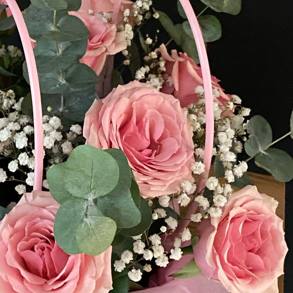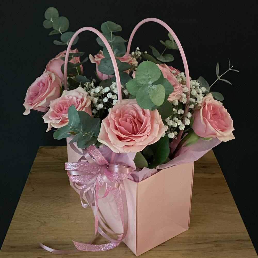 Gypsophila - 1 pcs Eucalyptus - 2 pcs Ecuador Rose - 9 pcs Postcard - 1 pcs Floral oasis - 1 pcs Mica packaging - 1 pcs Kraft bag with handles - 1 pcs