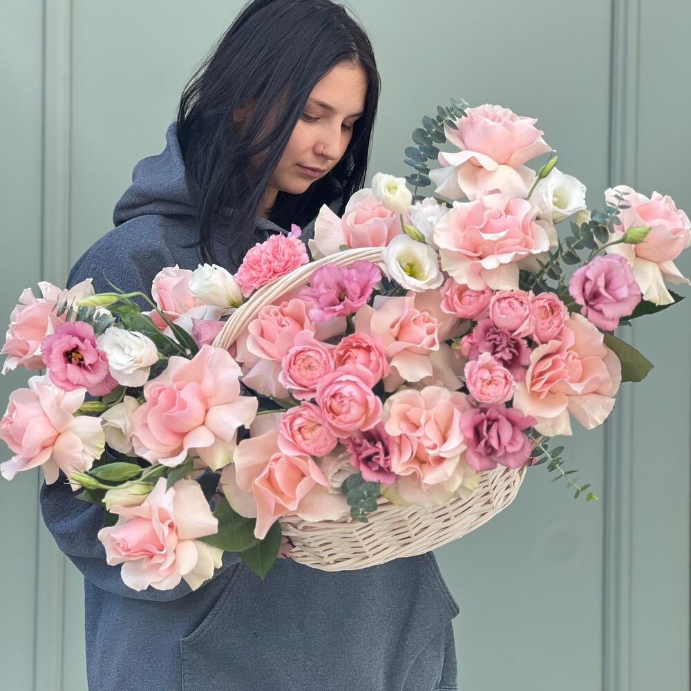 Eucalyptus - 2 pcs Carnation - 1 pcs Eustoma - 5 pcs Basket wicker - 1 pcs juliet bush rose peony - 2 pcs French roses - 15 pcs