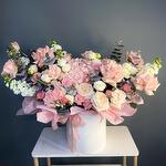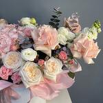 Lisianthus - 7 pcs Matthiola - 5 pcs Eucalyptus - 2 pcs Rose - 13 pcs Pink hydrangea - 1 pcs Spray rose - 9 pcs