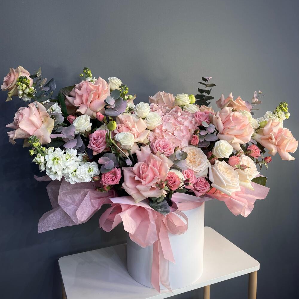 Lisianthus - 7 pcs Matthiola - 5 pcs Eucalyptus - 2 pcs Rose - 13 pcs Pink hydrangea - 1 pcs Spray rose - 9 pcs