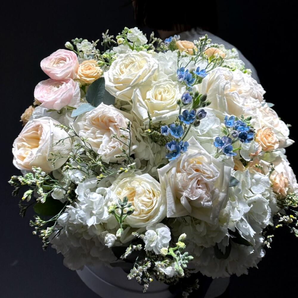 Hydrangea - 5 pcs Matthiola - 5 pcs Peony - shaped rose - 9 pcs Spray rose - 3 pcs ranunculi - 2 pcs