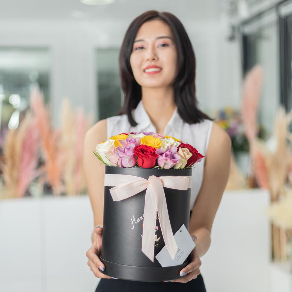25 mix of roses in a black box, wonderful roses in a box, are able to convey and give a warm and bright mood to your loved ones and relatives, friends and colleagues. Order roses in a box from H.Bonnar, please and pleasantly surprise.