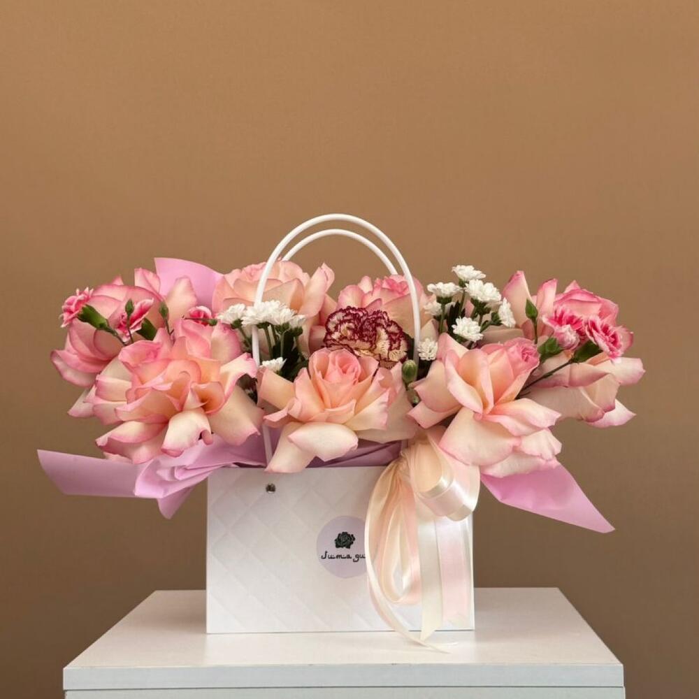 Rose - 7 pcs Chrysanthemum - 3 pcs Carnation - 5 pcs Cardboard bag - 1 pcs