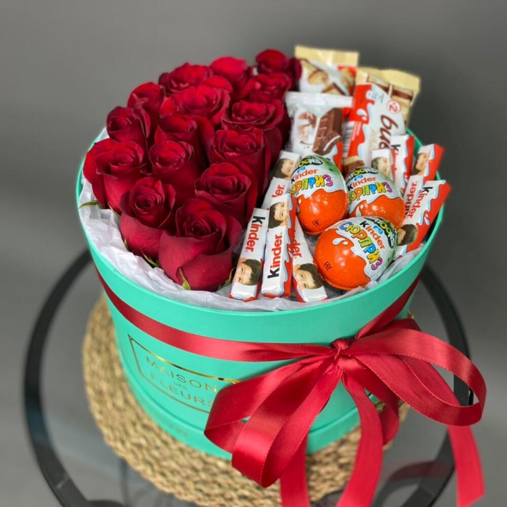 Цветы в коробке со сладостями и розами