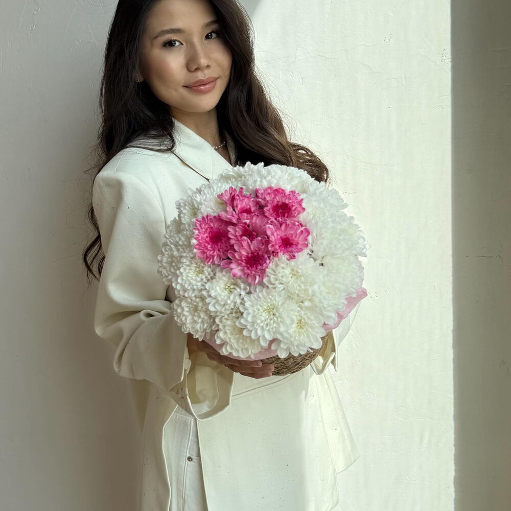 Погрузитесь в атмосферу нежности и респектабельности с нашей уникальной коробкой из цветов. Внутри комфортно расположились 23 кустовые белые хризантемы, обволакивающие своей свежестью и легкостью. Цветочное настроение интенсивно насыщается 7 розовыми хризантемами, дополняющими своим нежным оттенком игру оттенков. Эта композиция изящно подчеркнёт ваше внимание и заботу, станет прекрасным подарком для любого случая.