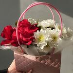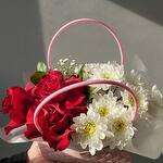 Gypsophila - 1 pcs Chrysanthemum bush - 2 pcs Handbag - 1 pcs Floral oasis - 1 pcs roses ecuador - 3 pcs