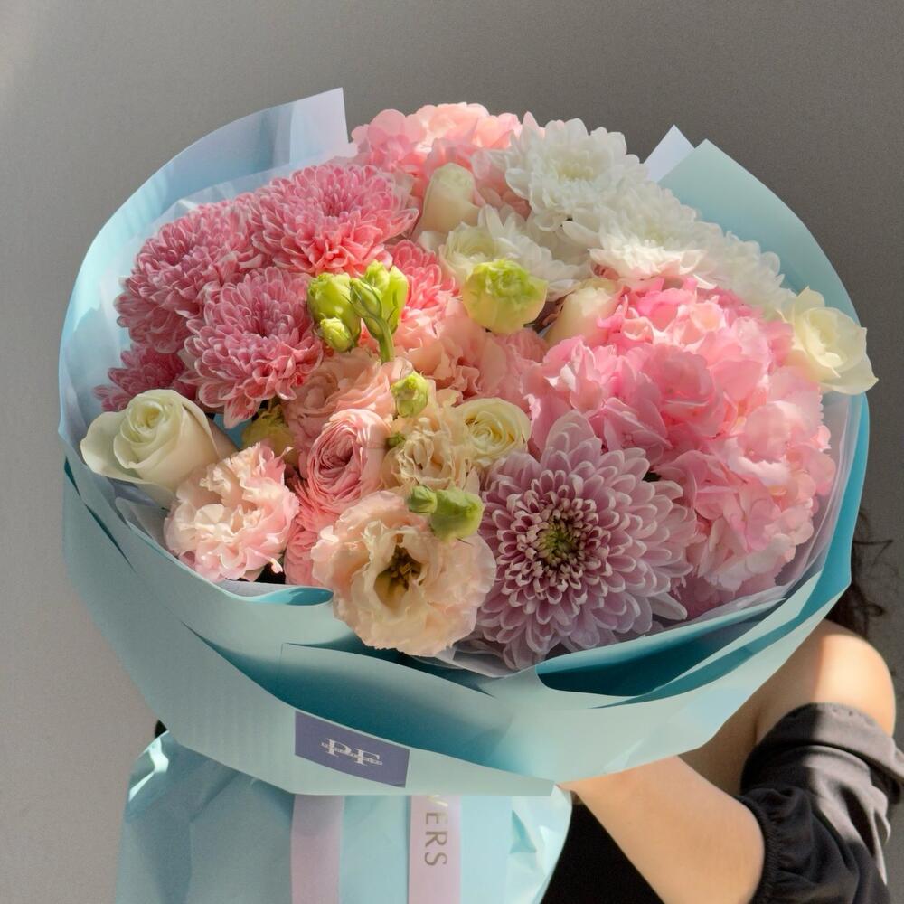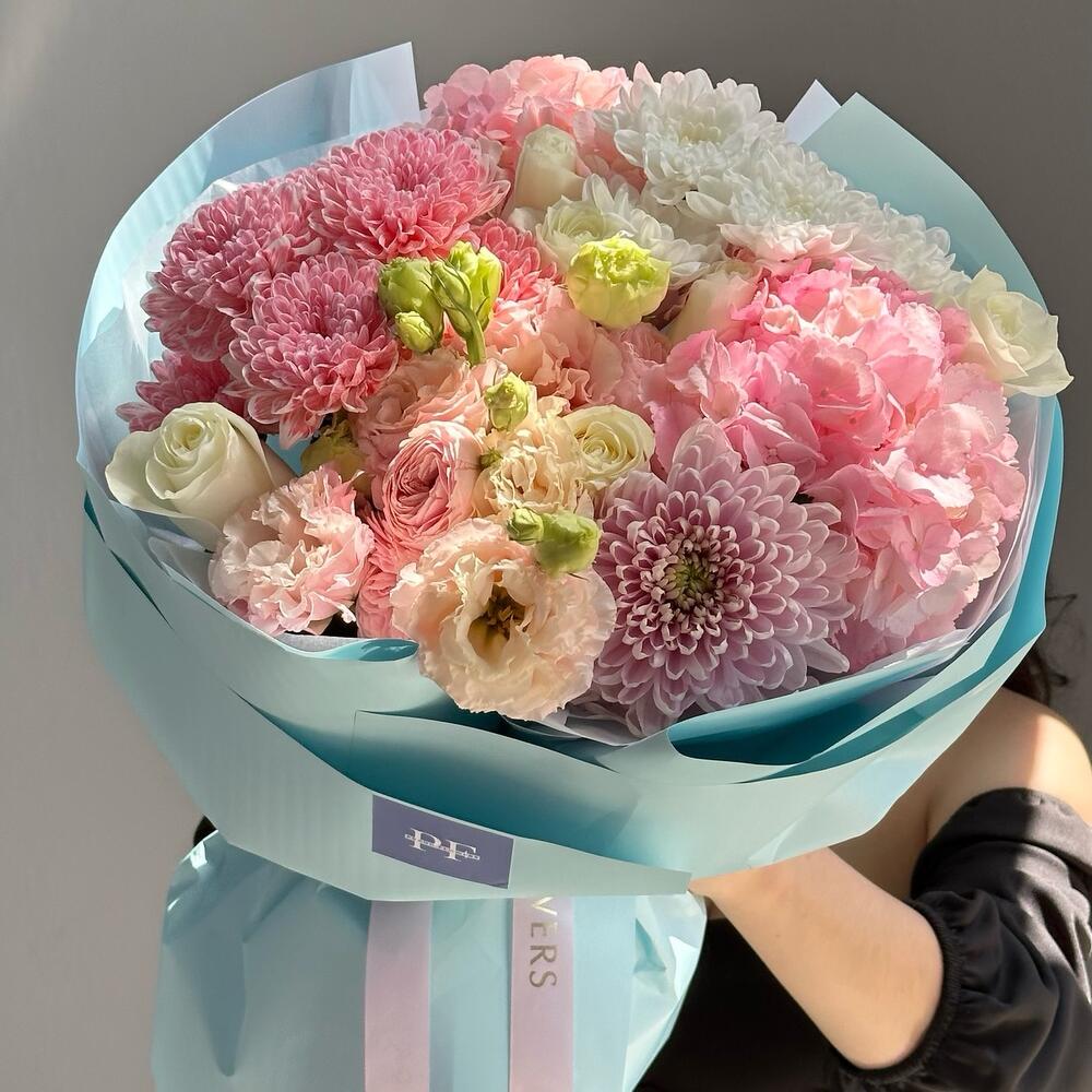 Chrysanthemum bush - 3 pcs Chrysanthemum one - headed - 1 pcs eustoma pink terry - 3 pcs mixed bouquet of flowers - 15 pcs hydrangea Royal - 2 pcs roses ecuador - 7 pcs aqua paper - 5 pcs