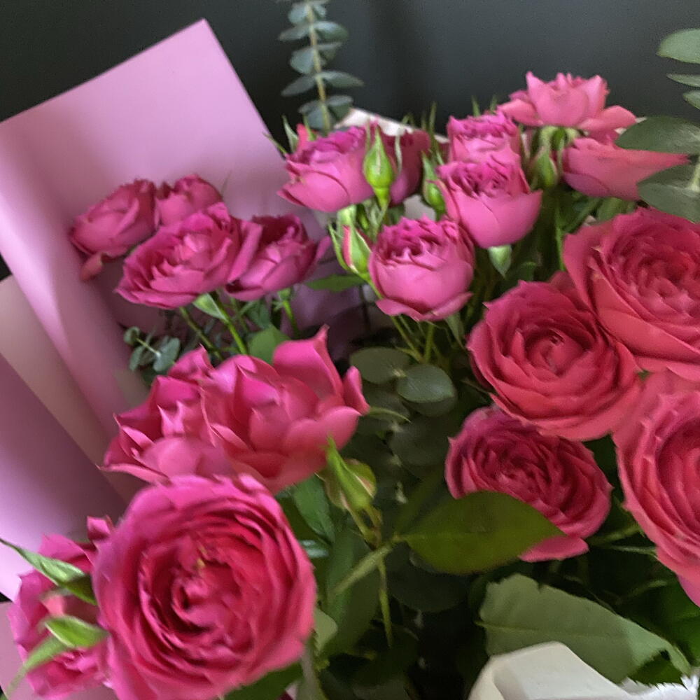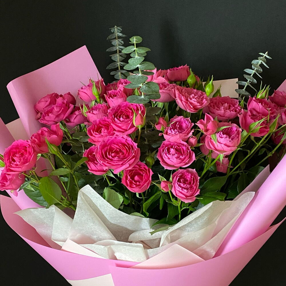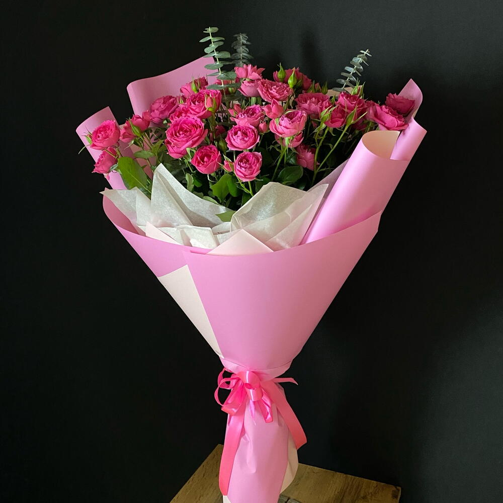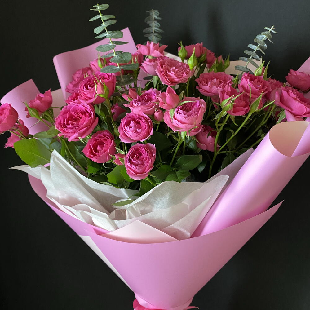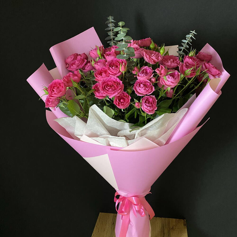 Eucalyptus - 2 pcs Crisal (top dressing) - 1 pcs a postcard with your wishes - 1 pcs the insulation of the bouquet - 1 pcs роза спрей софи - 9 pcs