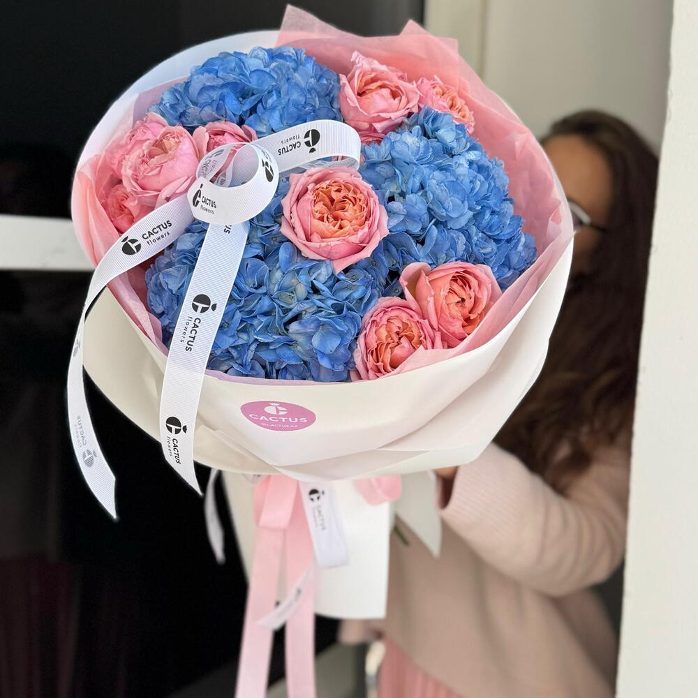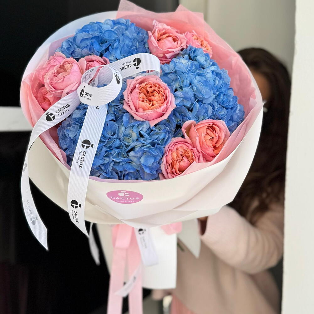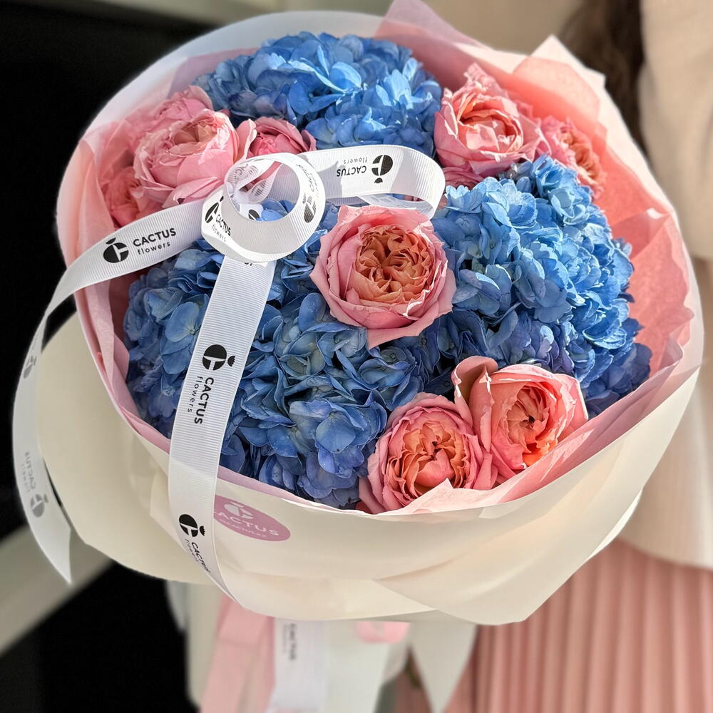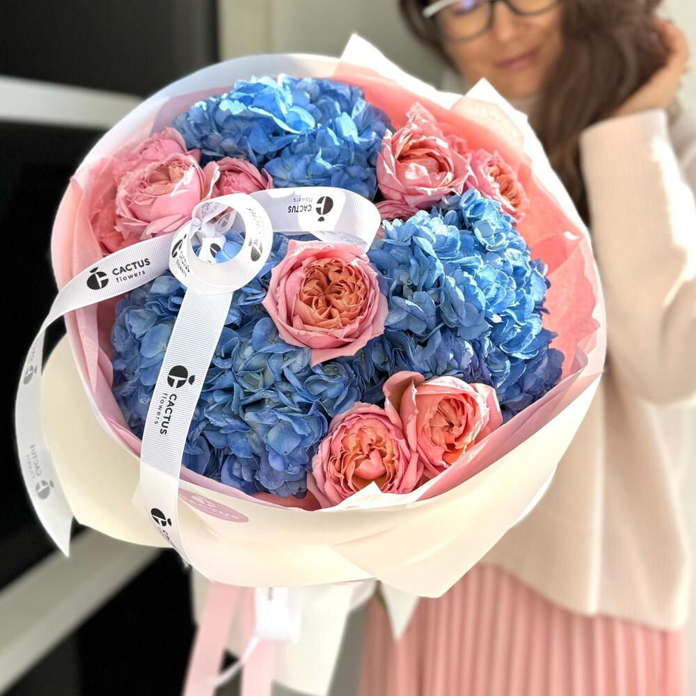 Для неё, ведь она такая же — нежная, утончённая и неповторимая. Дуо-букет из гортензии и роз Джульетта.