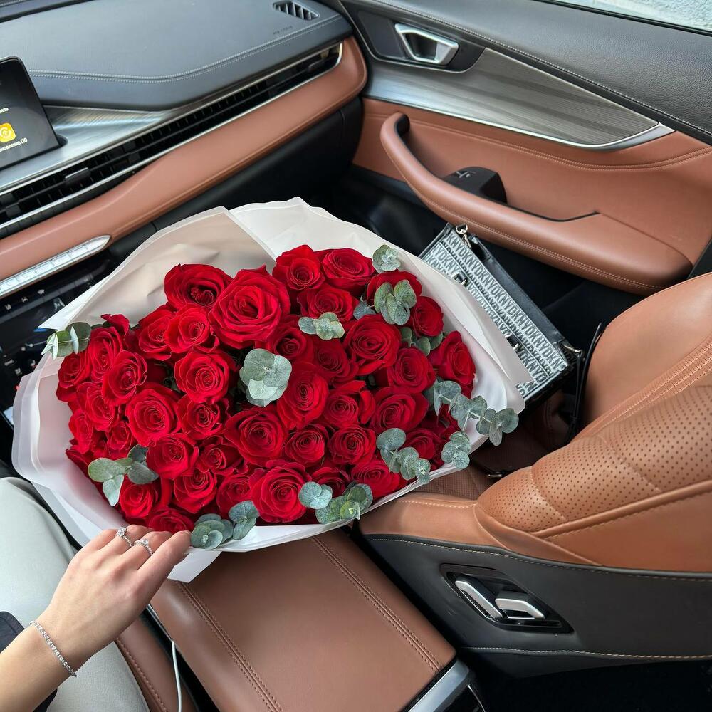 Композиция из 51 свежей розы с добавлением веточек эвкалипта, создающих утончённый контраст. Букет аккуратно упакован в белую крафтовую бумагу, которая подчеркивает естественную красоту цветов. Идеально подходит для торжественных случаев, романтических свиданий или выражения благодарности.