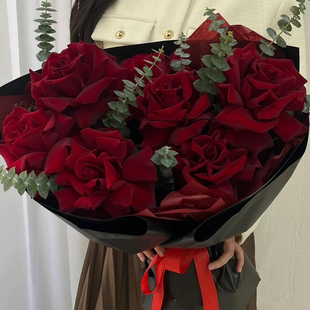 Designer packaging - 1 pcs Dutch Rose - 7 pcs Eucalyptus cinerea - 6 pcs