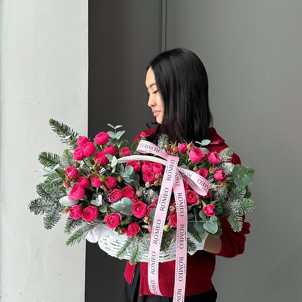 Basket - 1 pcs Tape - 1 pcs Eucalyptus - 1 pcs Silence - 2 pcs Oasis - 1 pcs Nobilis - 1 pcs Spray rose - 7 pcs