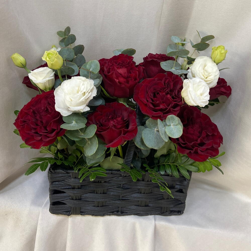 Ecuador Rose - 12 pcs Eustoma - 4 pcs Pistachio - 1 pcs Basket wicker - 1 pcs Eucalyptus cinerea - 1 pcs