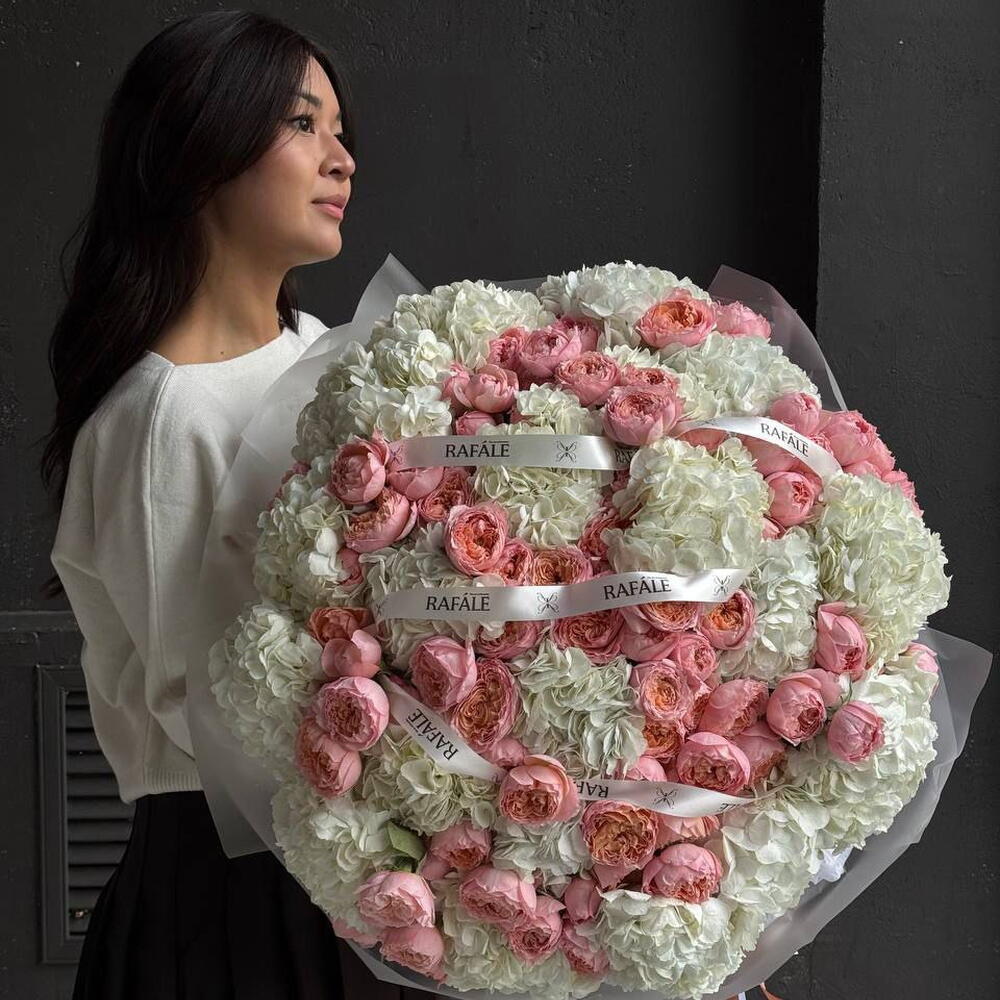 A grand, expressive, and truly impressive bouquet that you can't help but notice. Airy hydrangeas create volume and a cloud-like feel, while peony-style spray roses add depth, texture, and soft romance. EURO 1.0 — a gesture without compromise. It's about strong feelings, confidence, and the desire to amaze at first glance. Such a bouquet needs no words — it speaks for itself.