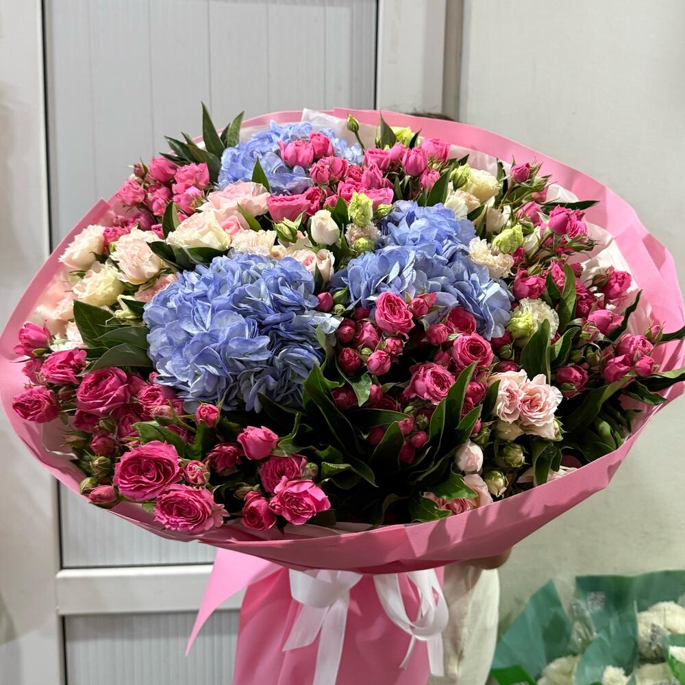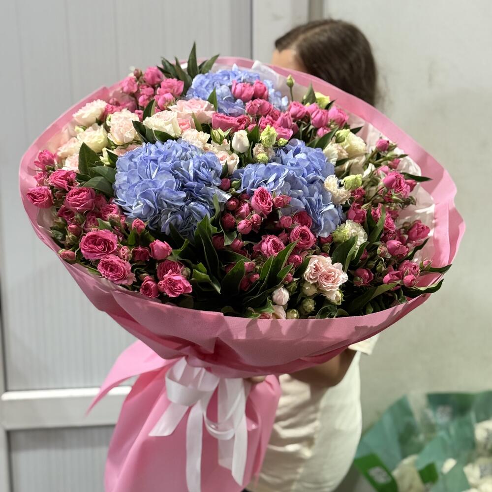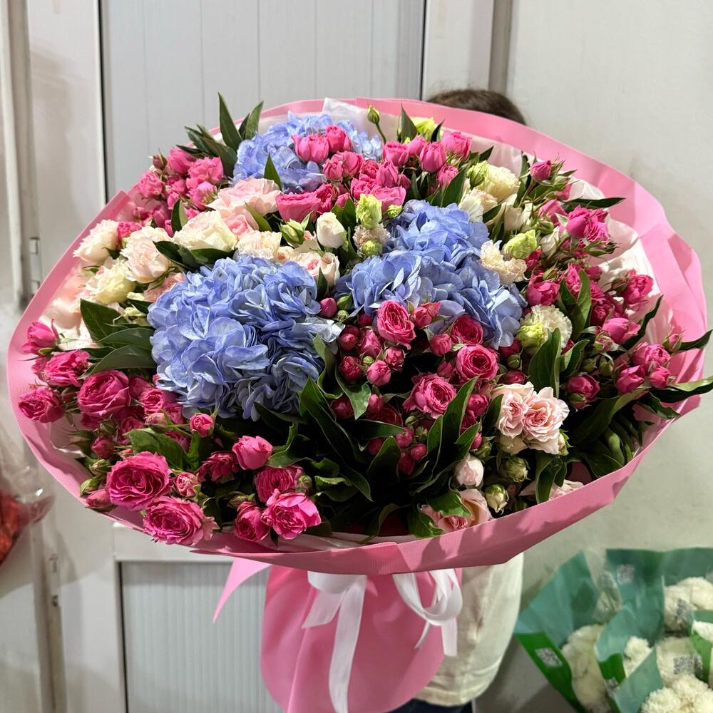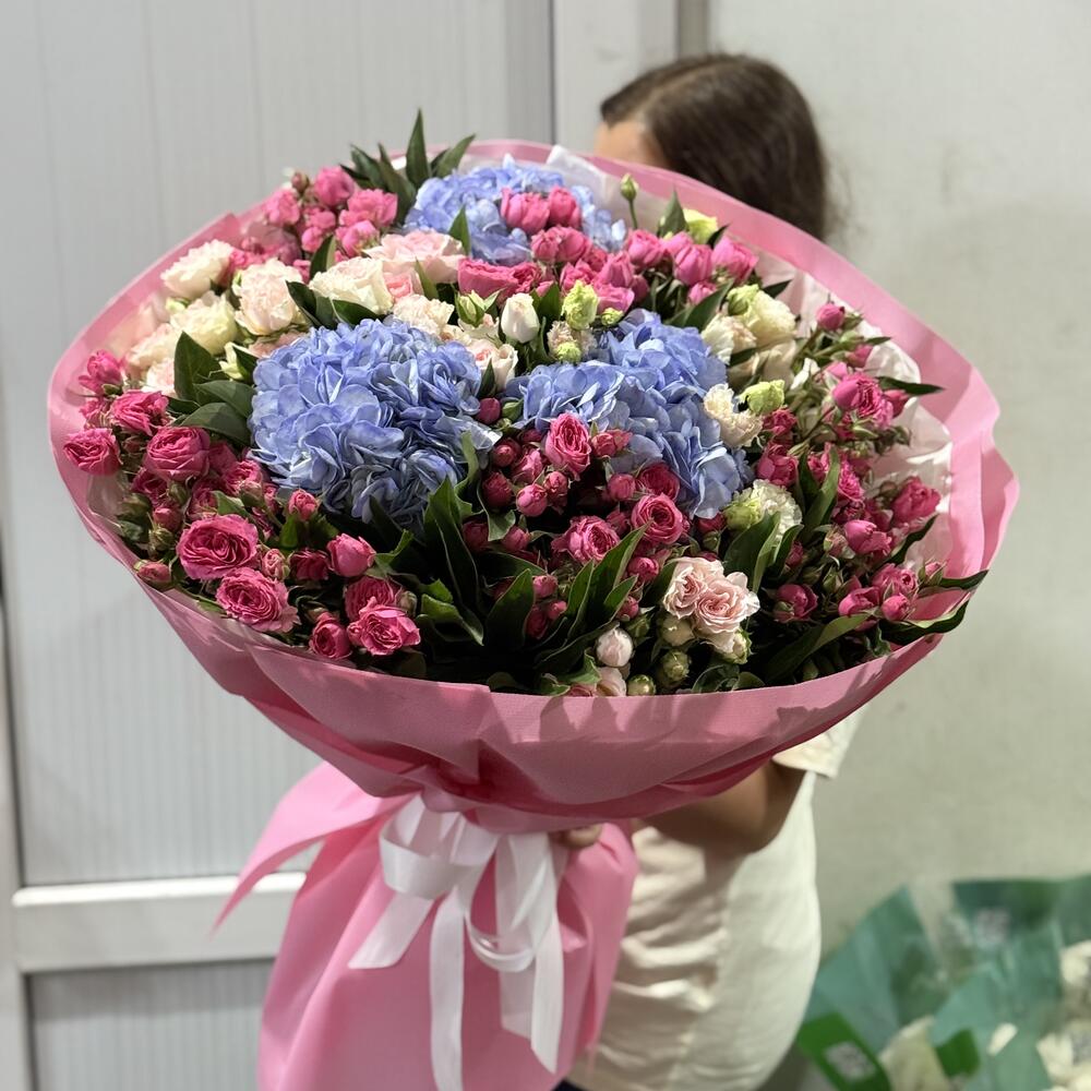 Объемный евро букет.С королевскими синими гортензиями и спрей кустовыми розами аква
