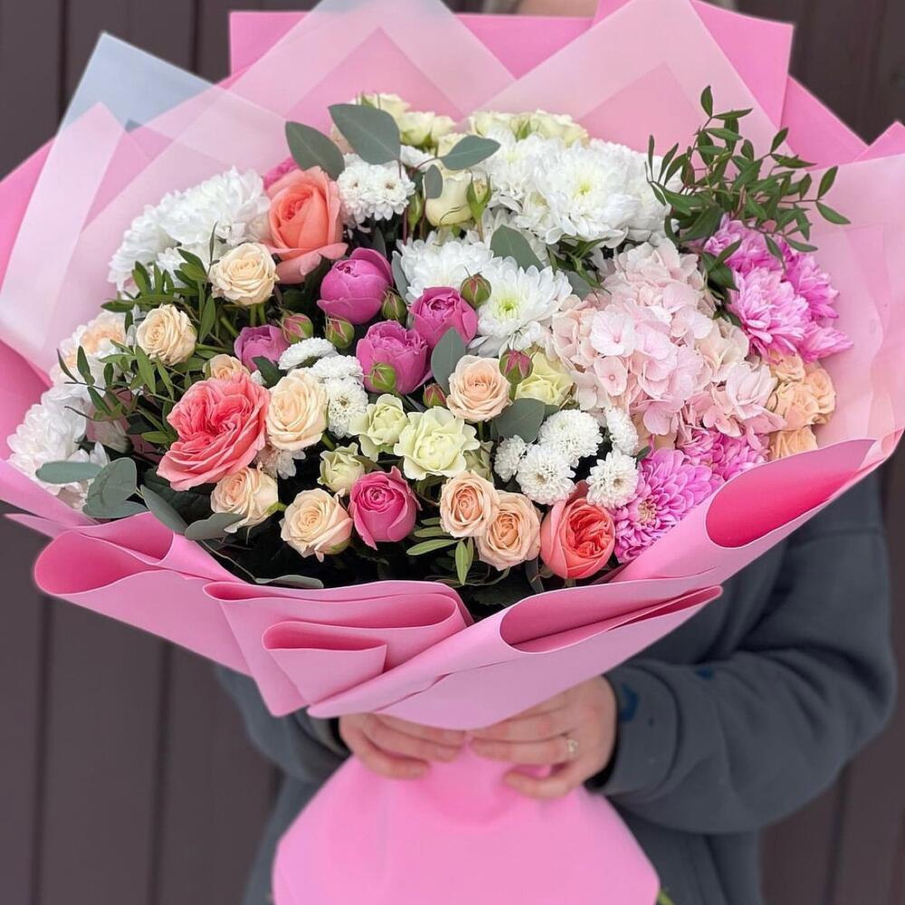 Hydrangea - 1 pcs Rose - 7 pcs Bush rose - 5 pcs Chrysanthemum - 5 pcs