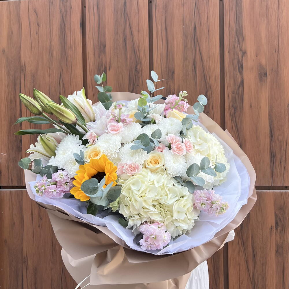 Hydrangea - 2 pcs Lily - 1 pcs Matthiola - 5 pcs Eucalyptus - 2 pcs Rose - 4 pcs Spray carnation - 5 pcs Sunflower yellow - 1 pcs