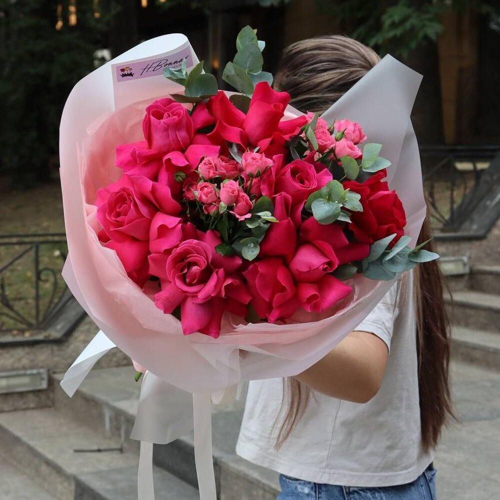 Eucalyptus - 2 pcs roses - 7 pcs bush roses - 2 pcs