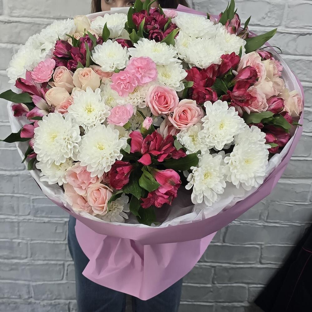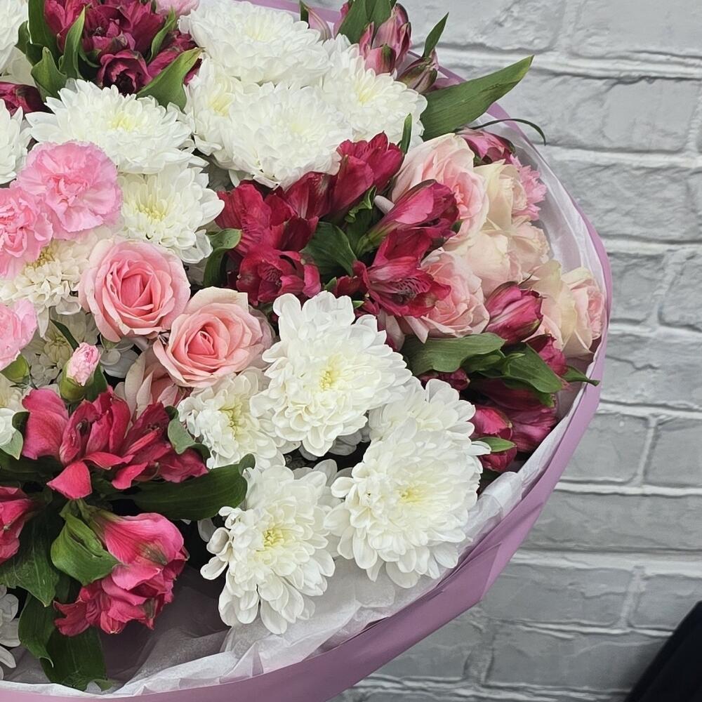 Alstroemeria - 7 pcs Chrysanthemum bush - 6 pcs Satin ribbon - 1 pcs Silence - 3 pcs Spray carnation - 3 pcs Spray rose - 7 pcs aquabumage - 4 pcs
