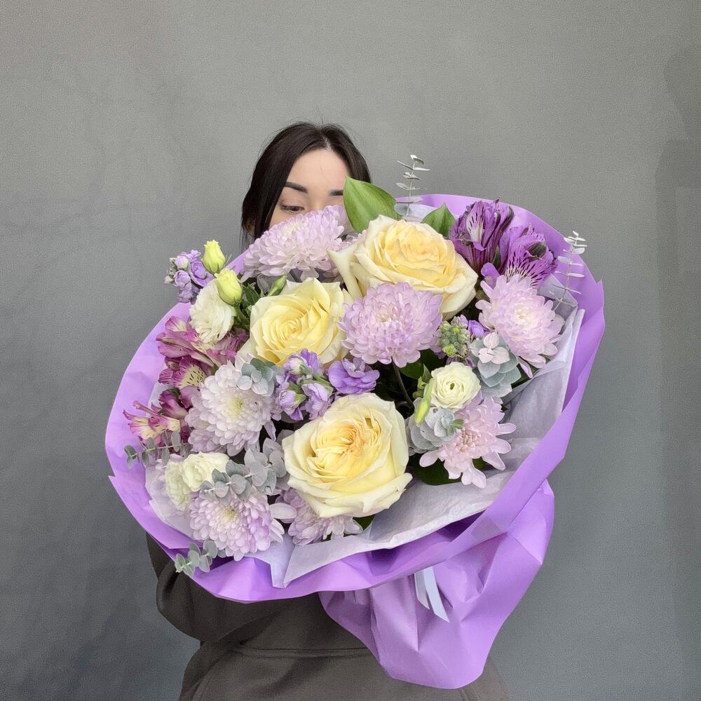 Alstroemeria - 2 pcs Matthiola - 3 pcs Chrysanthemum bush - 3 pcs Peony - shaped rose - 3 pcs