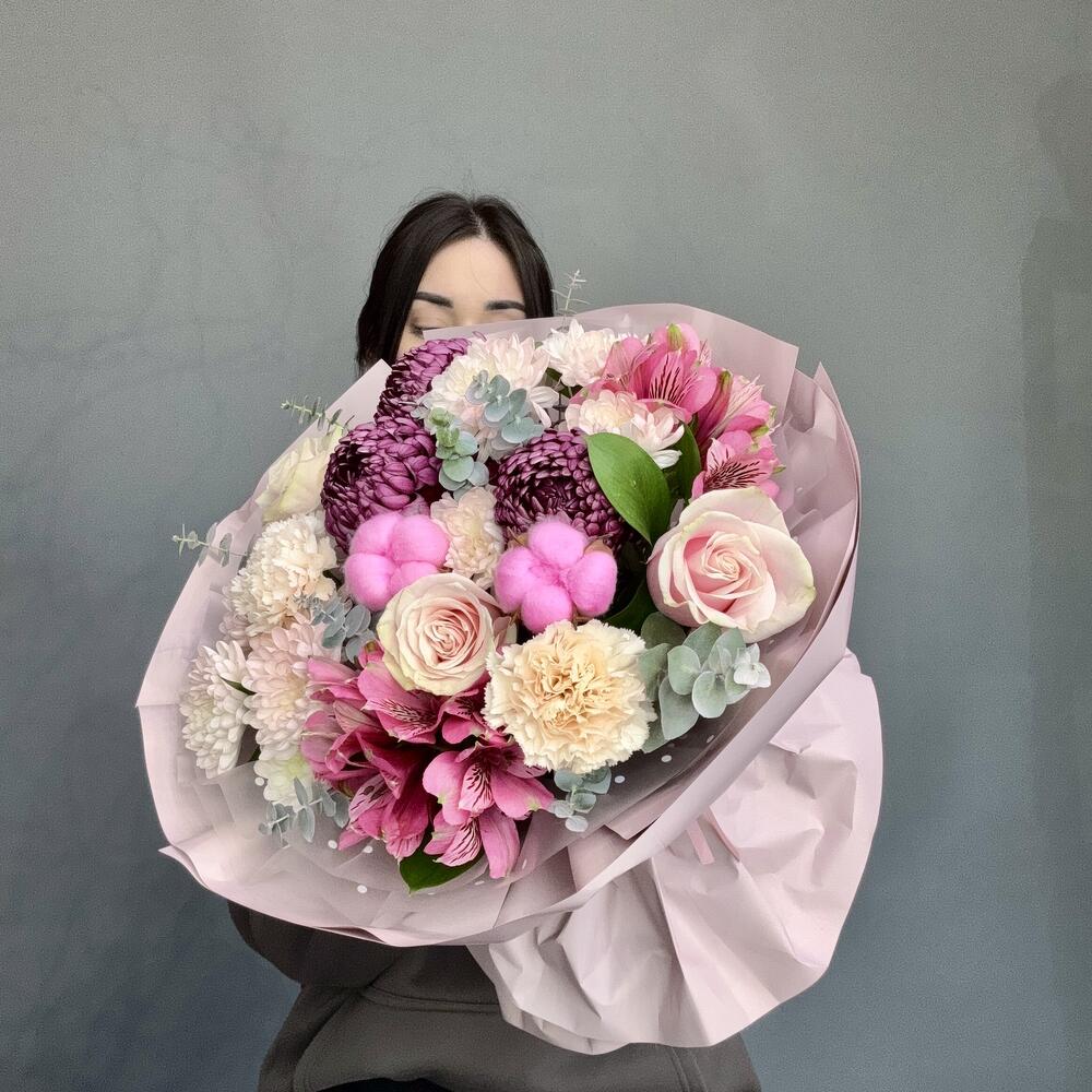 Alstroemeria - 2 pcs Cotton - 2 pcs Rose - 3 pcs Chrysanthemum - 3 pcs Dianthus - 3 pcs