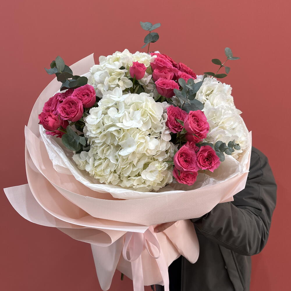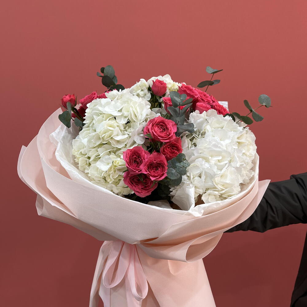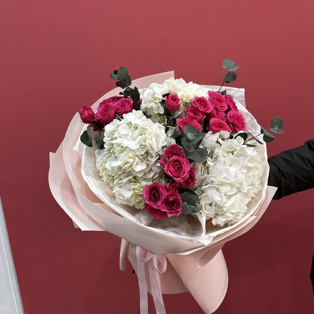 Hydrangea - 3 pcs Eucalyptus - 1 pcs кустовые розы софия - 5 pcs