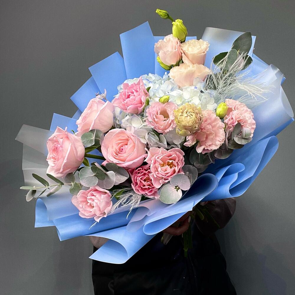 Hydrangea - 1 pcs Eustoma - 5 pcs Peony - shaped tulip - 3 pcs Ohara - 3 pcs