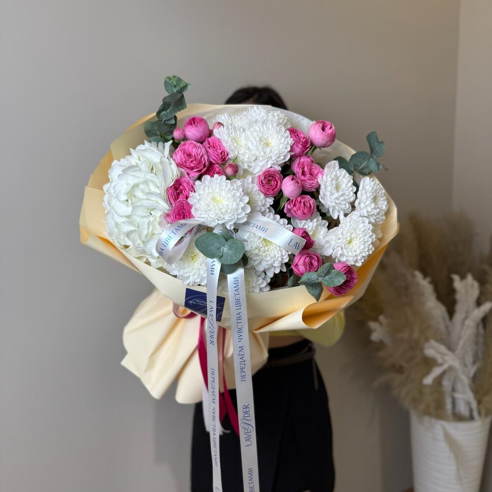 Hydrangea - 1 pcs Eucalyptus - 3 pcs Bush rose - 3 pcs Chrysanthemum - 3 pcs