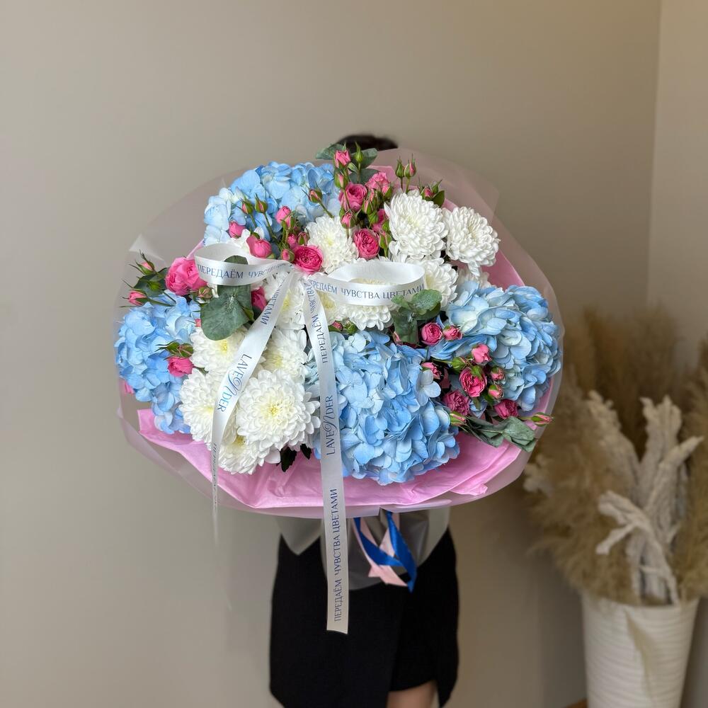 Eucalyptus - 3 pcs chrysanthemums - 4 pcs hydrangeas - 4 pcs bush roses - 4 pcs