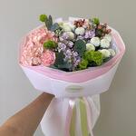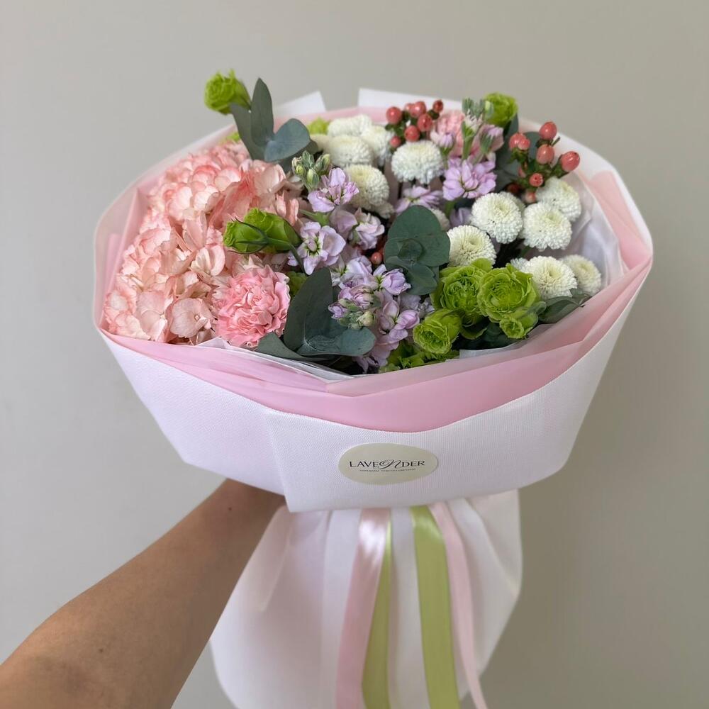 Hypericum - 1 pcs Hydrangea - 1 pcs Matthiola - 3 pcs Eustoma - 3 pcs Chrysanthemum mix - 2 pcs жака - 1 pcs