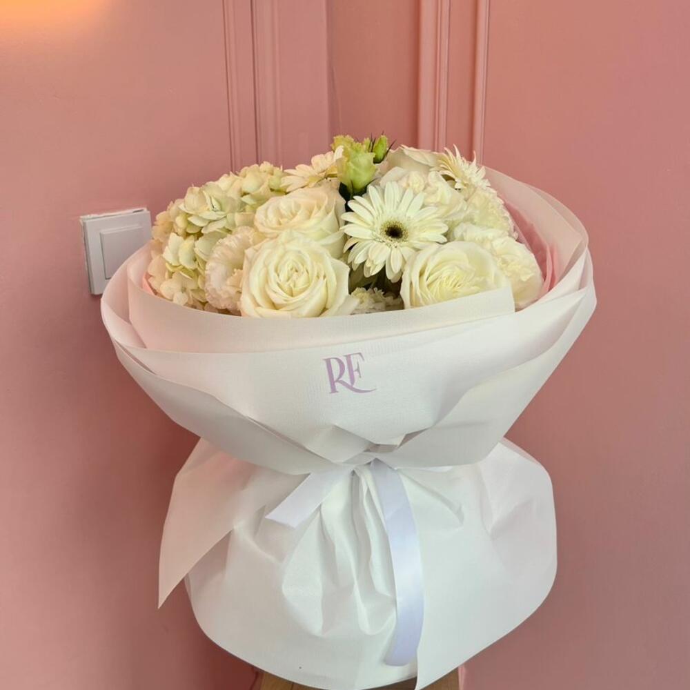 Hydrangea - 1 pcs Lisianthus - 1 pcs Rose - 7 pcs Gerbera - 3 pcs