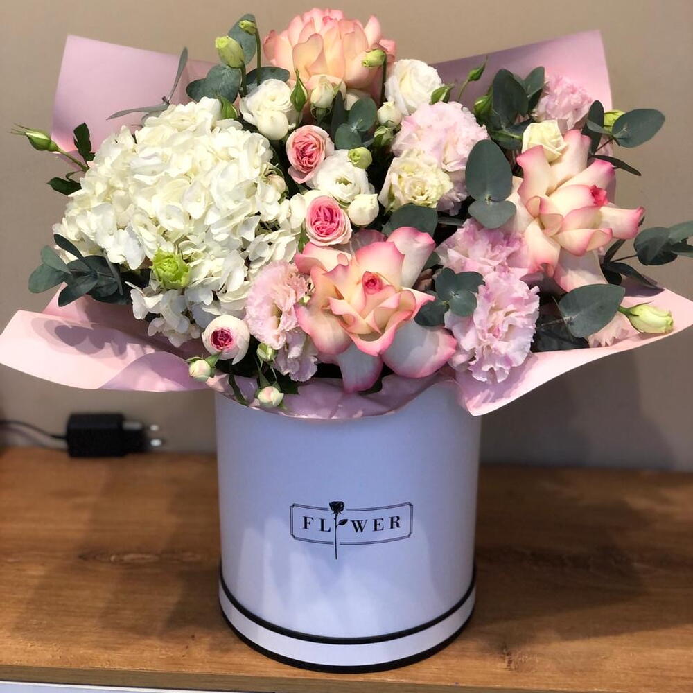 Hydrangea - 1 pcs Lisianthus - 3 pcs Eucalyptus - 3 pcs Rose - 3 pcs Spray rose - 2 pcs