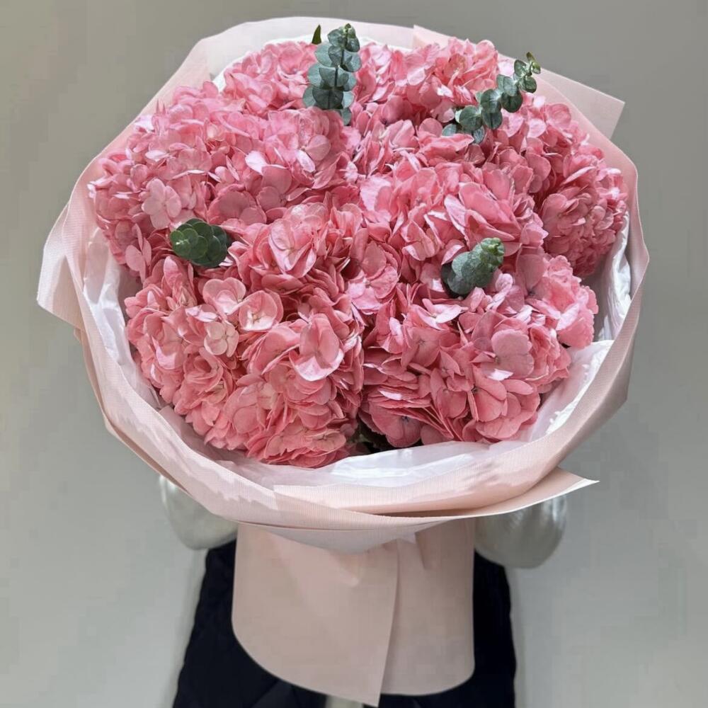 This striking mono bouquet in a soft pink palette will make a wonderful gift for any occasion. It includes seven flowering pink hydrangeas, complemented by four eucalyptus branches. This bouquet not only looks exquisite but will also fill your room with the fresh scent of eucalyptus, creating a light, fresh atmosphere. A simple yet refined choice for those who appreciate natural beauty and elegance.
