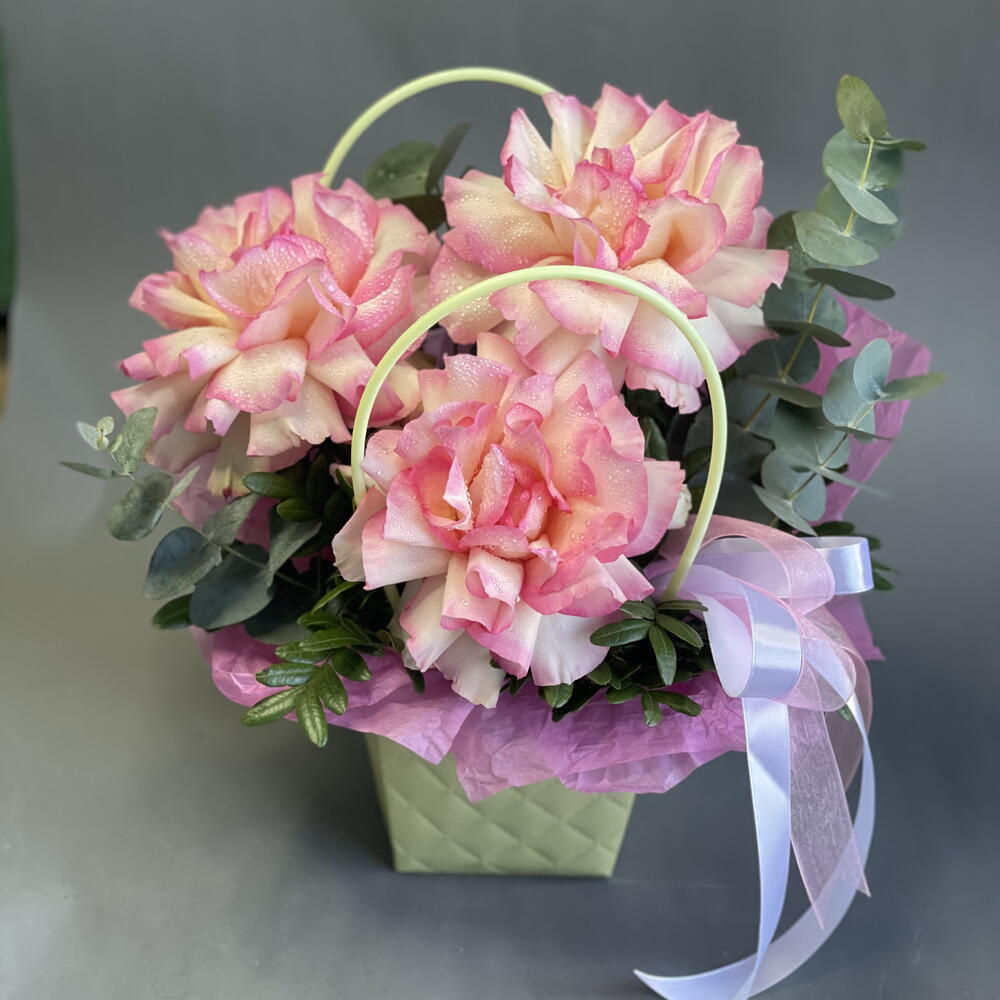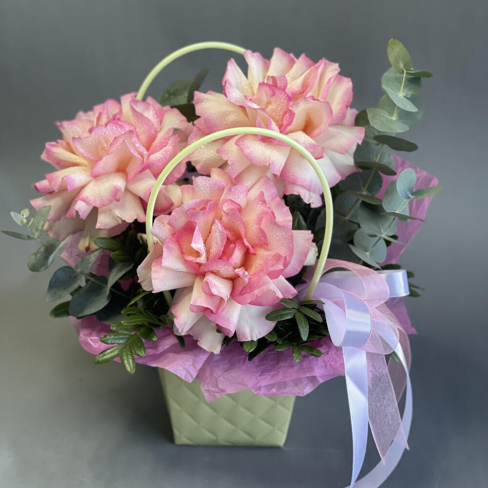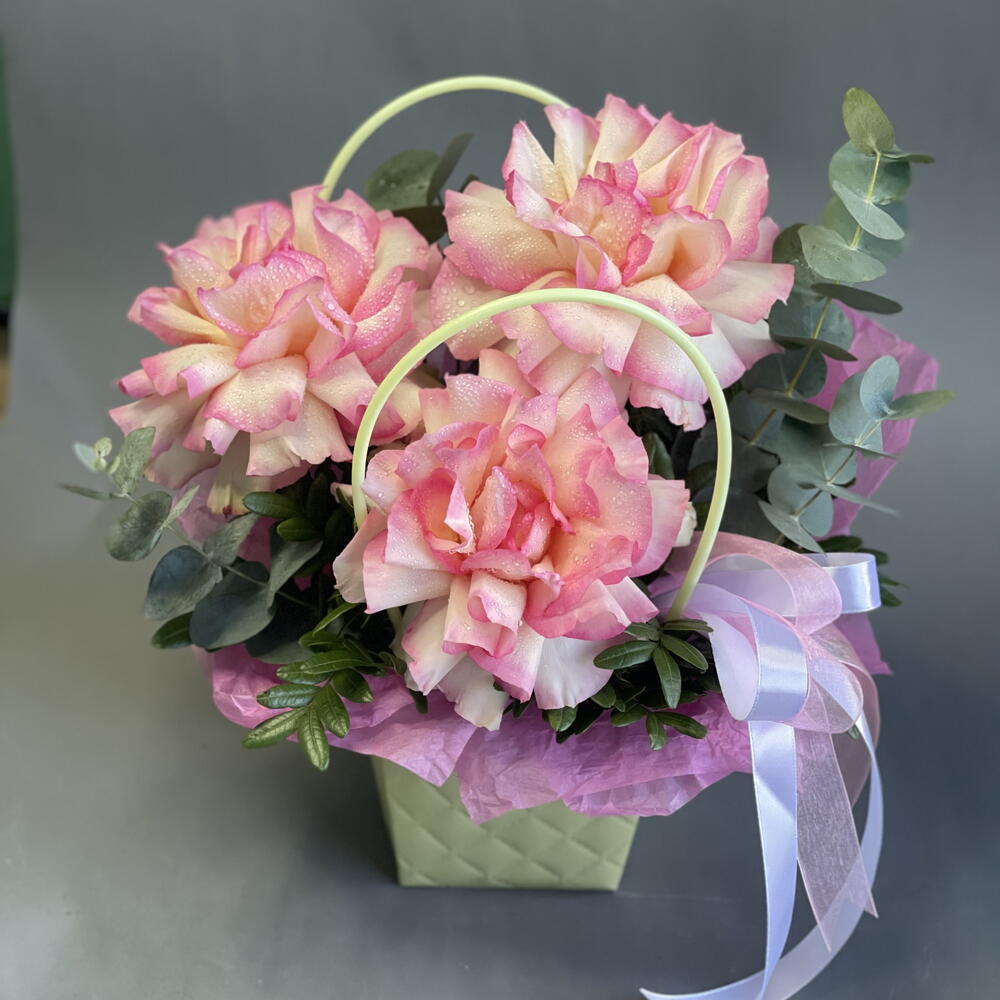 Элегантная композиция в сумочке, состоящая из трёх роскошных роз, дополненная ажурными веточками эвкалипта. Идеальный подарок, сочетающий в себе утончённость, стиль и нежное послание.