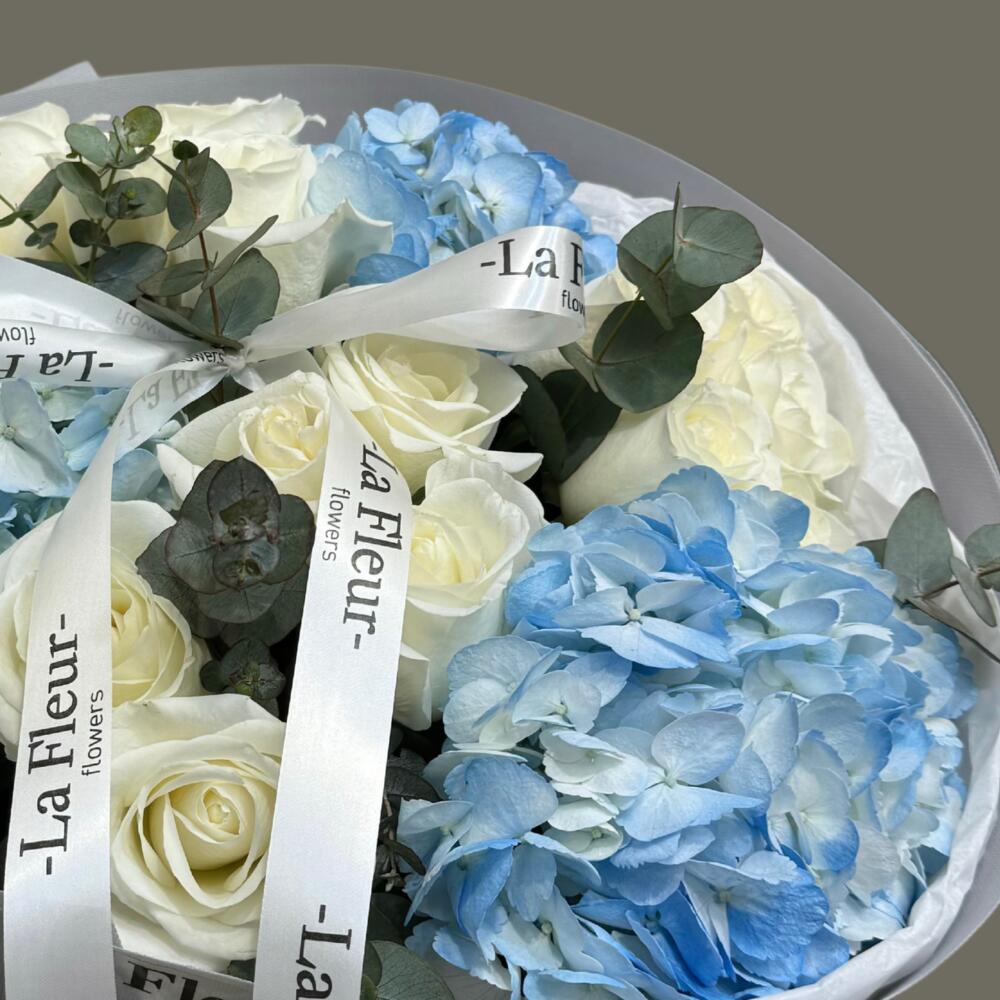Стильный и холодный по цвету, но тёплый по смыслу букет. Голубые гортензии и розы с эвкалиптом создают неповторимый образ.