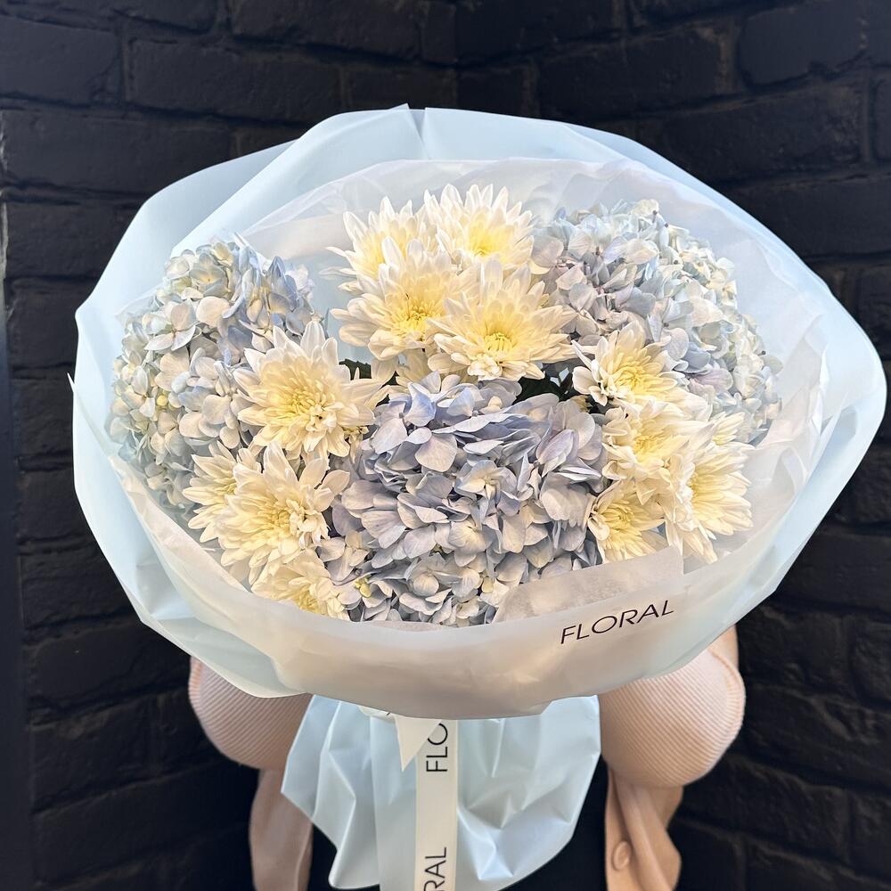 Этот авторский букет объединяет в себе изысканный шарм и благородную красоту. Три нежных гортензии, словно воплощение летнего утра, идеально сочетаются с тремя премиум хризантемами, добавляя композиции роскоши и элегантности. Этот букет - идеальный выбор, когда вы хотите проявить свои чувства или просто украсить свой дом.