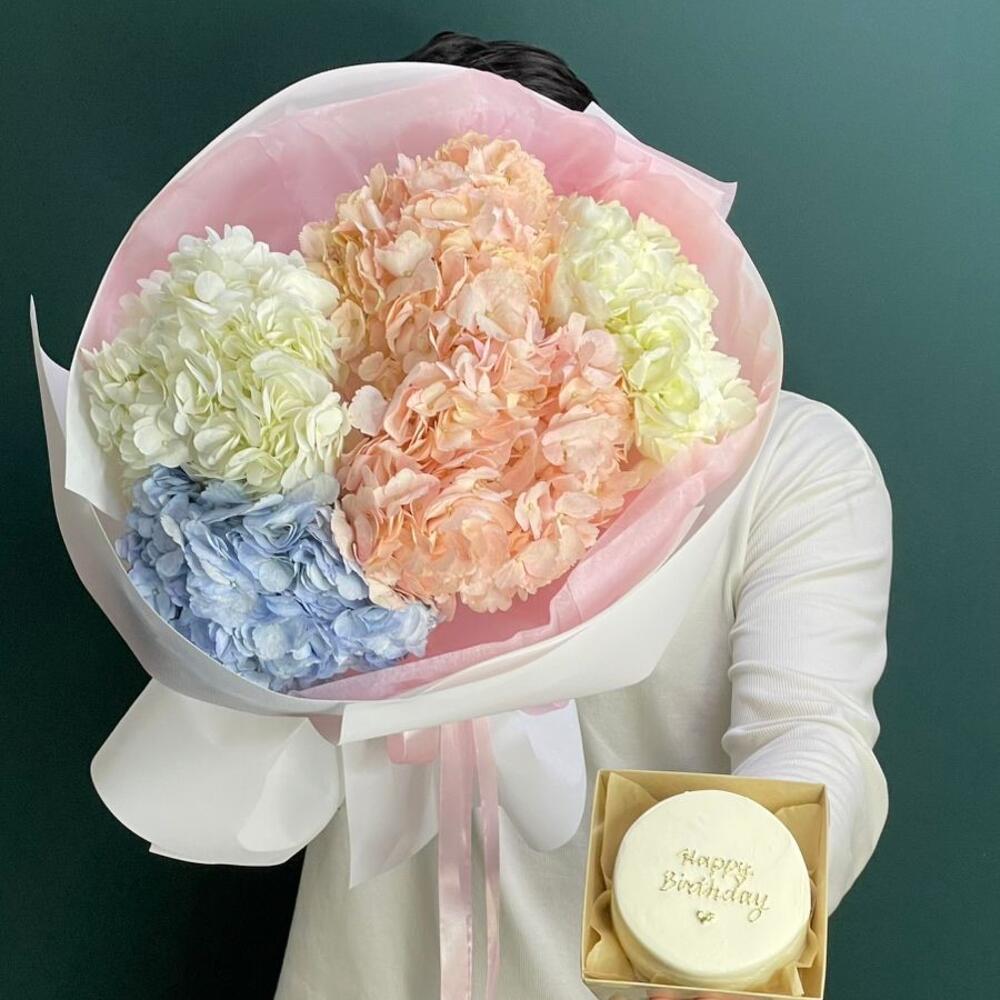 🎀 5 пышных гортензий + бенто-тортик — готовый рецепт счастья в одном подарке. Объёмные шапки гортензий в нежных оттенках создают атмосферу уюта и романтики, а милый бенто-тортик — сладкая точка этого сюрприза. 🌸 Дарите эмоции, которые невозможно забыть: цветы восхищают взгляд, торт радует вкус, а вместе — это момент, который останется в сердце. Вкус бенто тортика ванильный, начинка вупипай