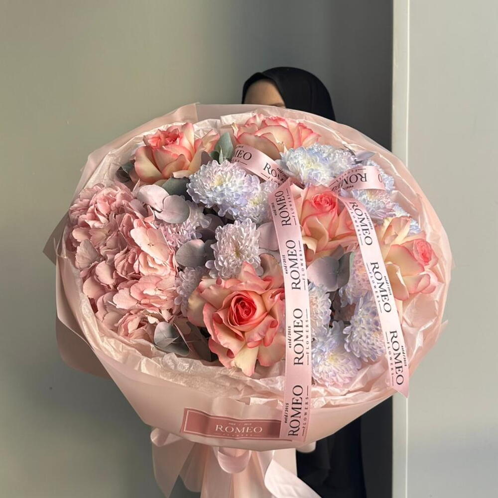 Hydrangea - 1 pcs Tape - 1 pcs Chrysanthemum bush - 3 pcs Eucalyptus - 1 pcs Rose - 5 pcs Decoration - 1 pcs