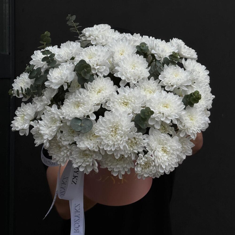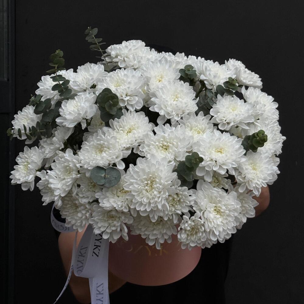 Chrysanthemum bush - 8 pcs Designer packaging - 2 pcs Floral oasis - 1 pcs Eucalyptus Baby Blue - 2 pcs box floral - 1 pcs