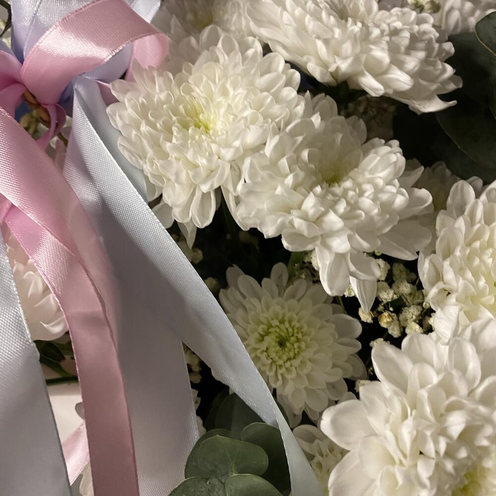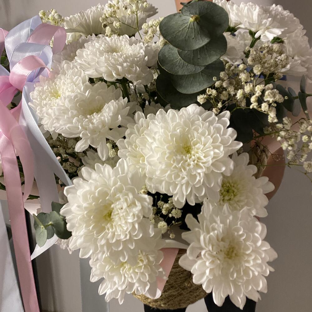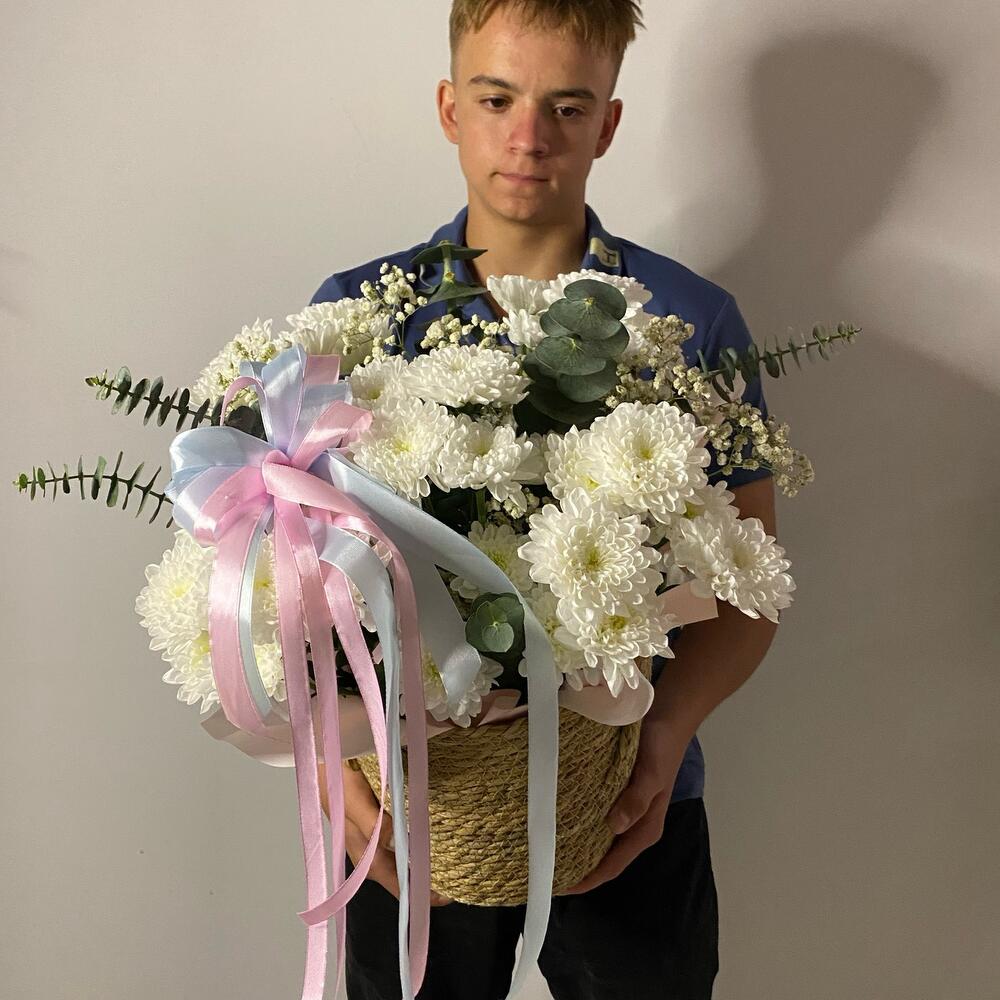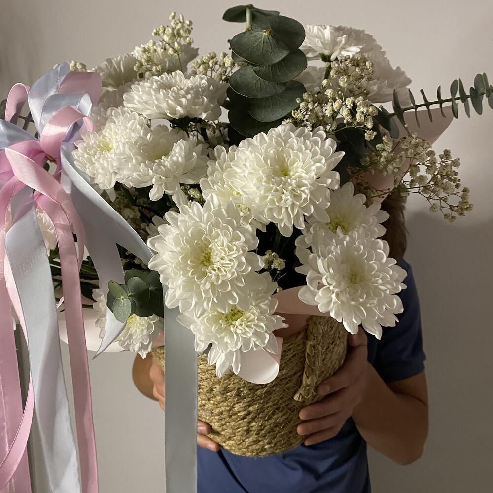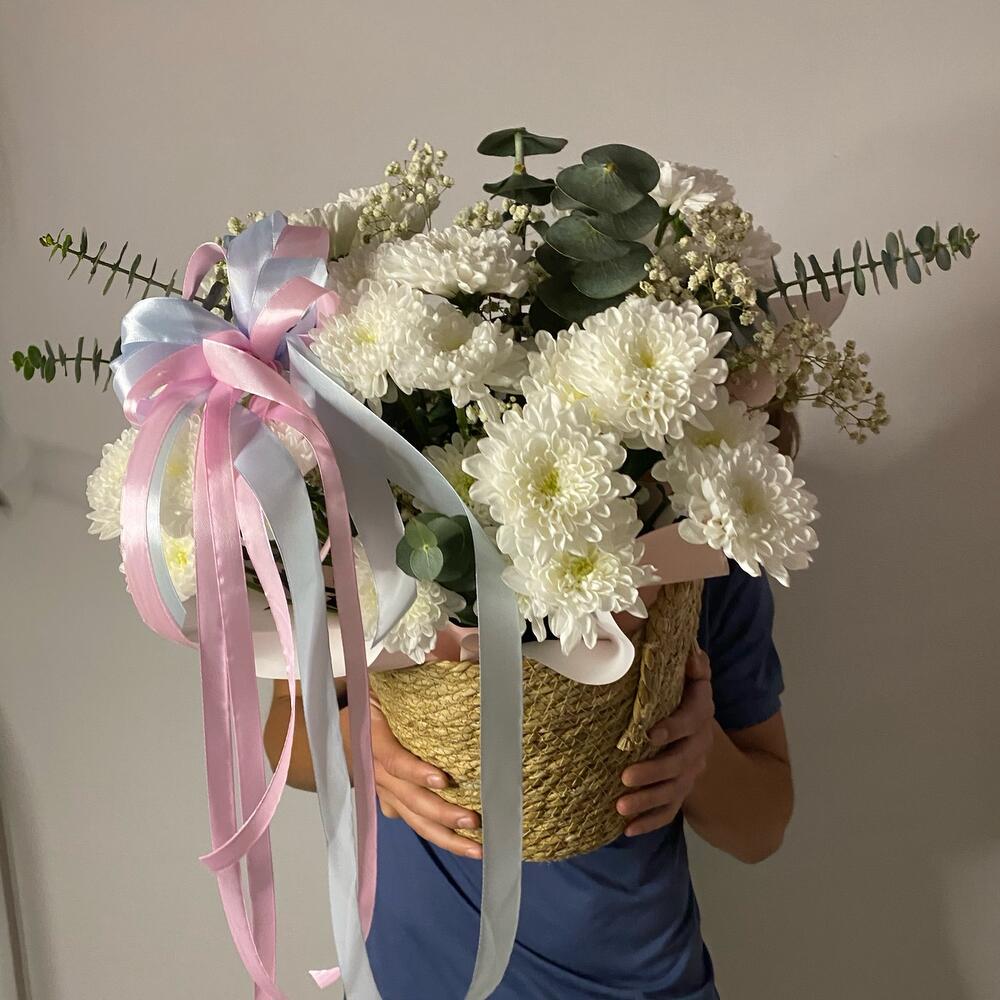 Gypsophila - 1 pcs Chrysanthemum bush - 5 pcs Eucalyptus - 2 pcs Satin ribbon - 2 pcs Basket wicker - 1 pcs Floral oasis - 1 pcs a postcard with your wishes - 1 pcs