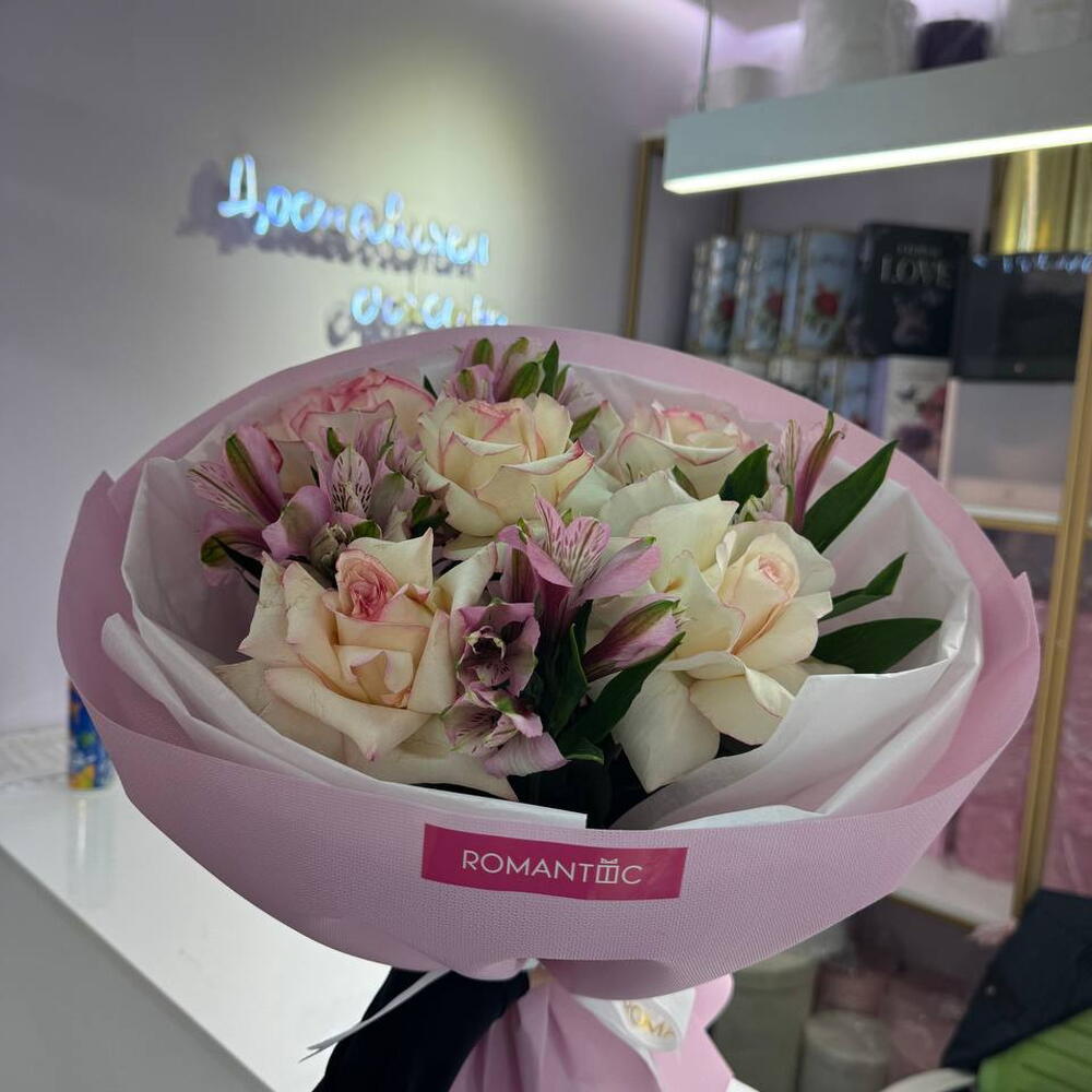 Этот авторский букет, нежно объединивший в себе 4 изящные альстромерии и 5 бархатных роз, станет символом теплых эмоций, воспоминаний или благодарности. Подарите своим близким сказку, украшенную этим прекрасным цветочным ансамблем.