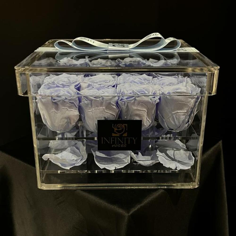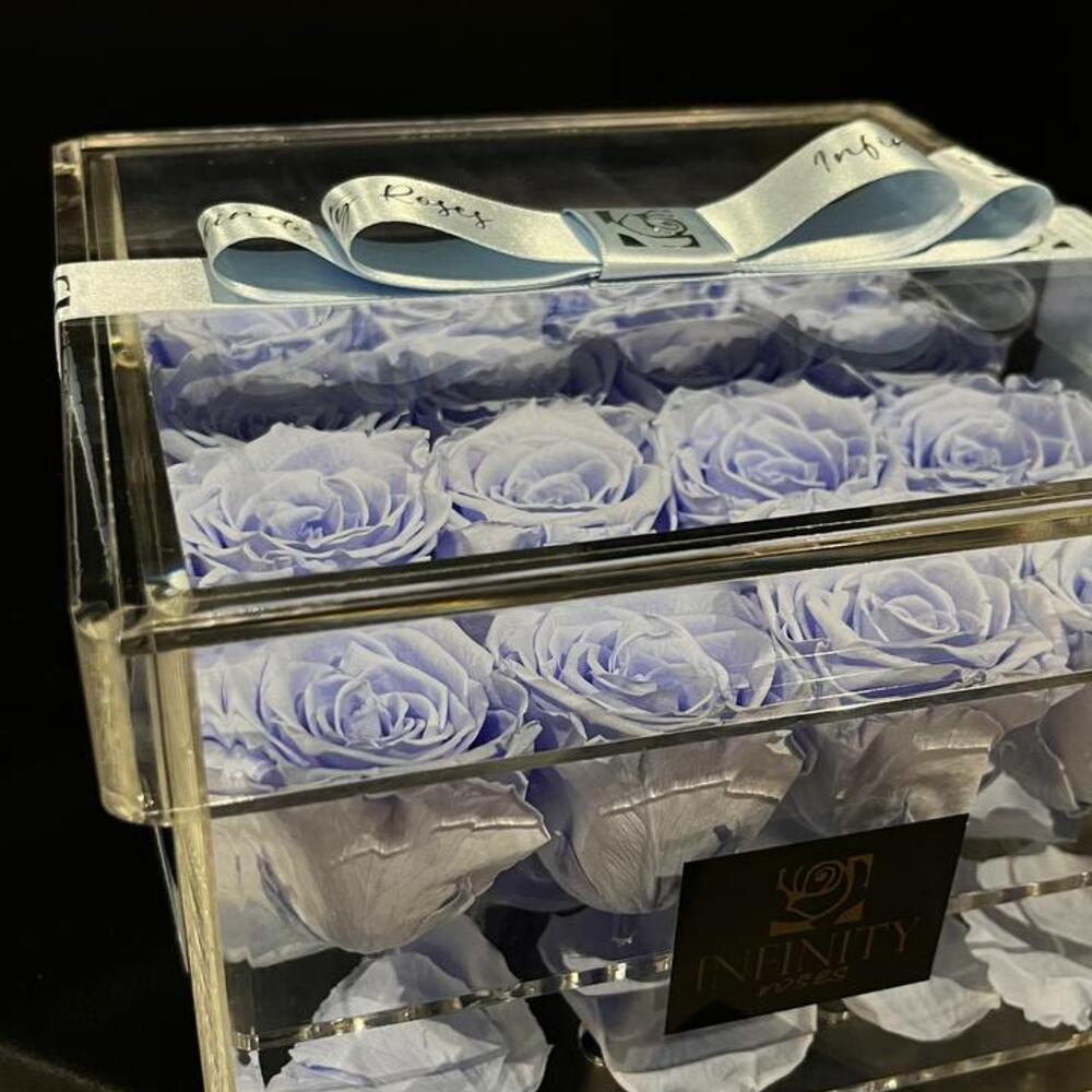 стабилизированные розы (нежно-голубые) - 16 pcs акриловая коробка с логотипом infinity - 1 pcs атласная лента (в тон роза) - 1 pcs