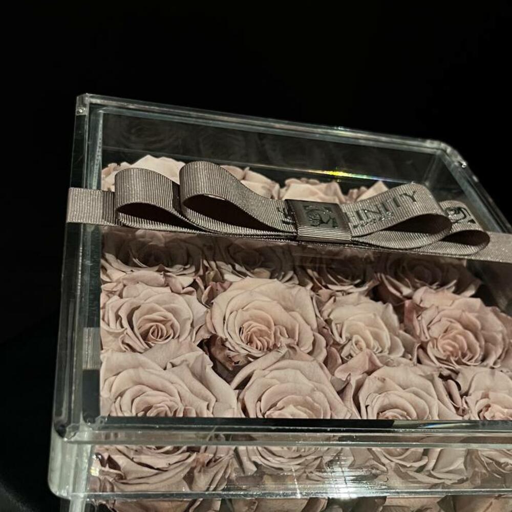 стабилизированные розы (кофейного оттенка) - 16 pcs прозрачный акриловый бокс с фирменным логотипом infinity - 1 pcs атласная лента (в цвет композиции) - 1 pcs