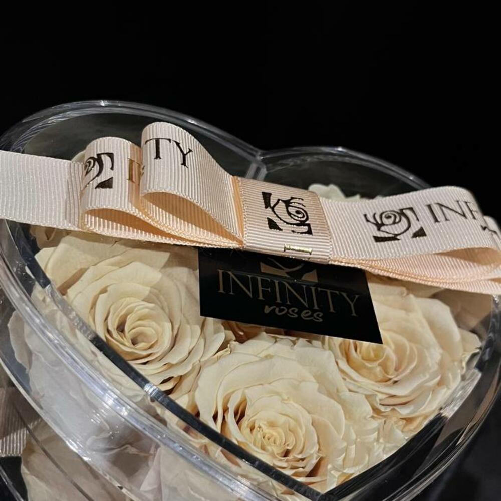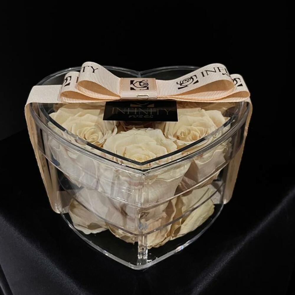 акриловая коробка в форме сердца с логотипом infinity - 1 pcs стабилизированные розы (кремовый оттенок) - 18 pcs атласная лента (кремовая с золотым логотипом infinity) - 1 pcs