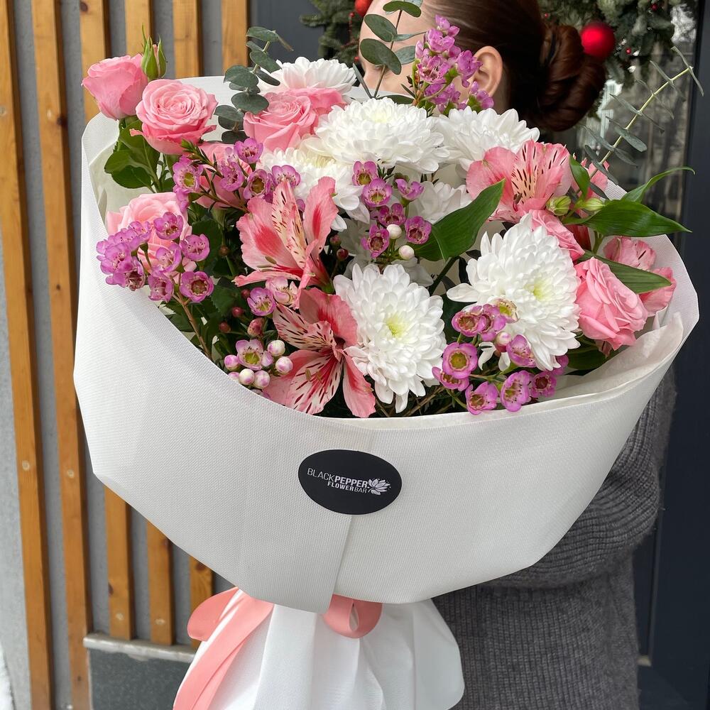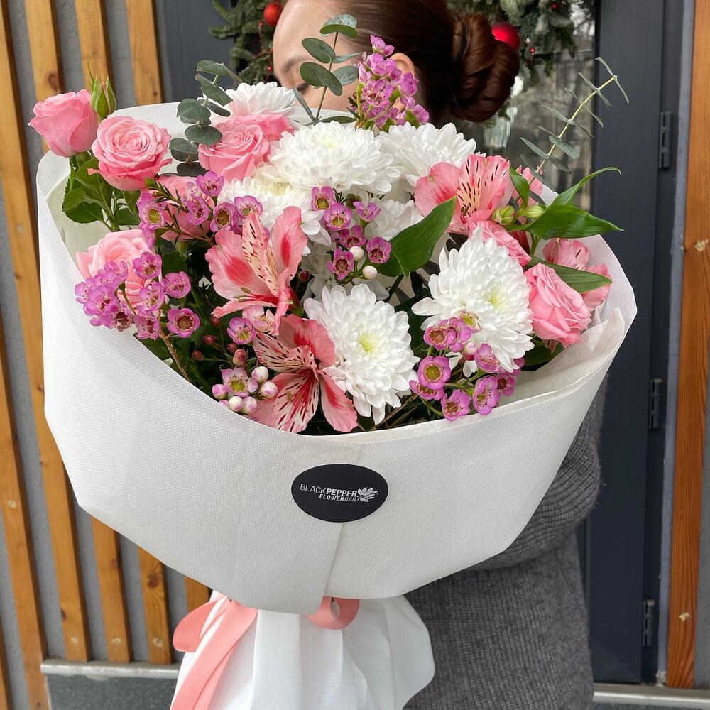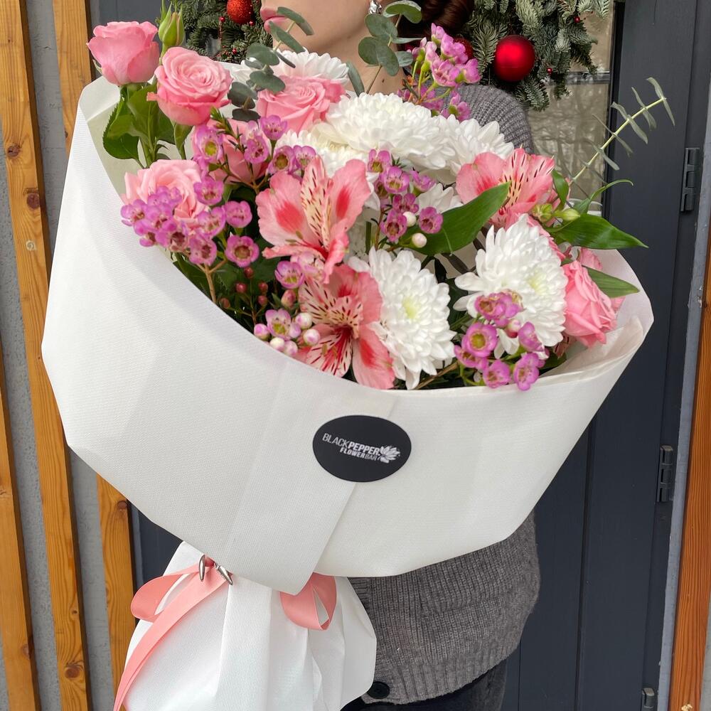 Alstroemeria - 2 pcs Waxflower - 3 pcs Chrysanthemum bush - 2 pcs Bush rose - 2 pcs